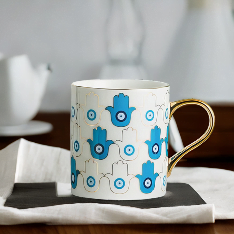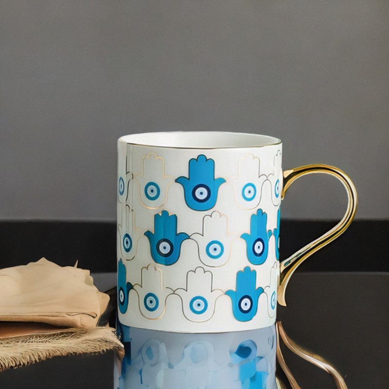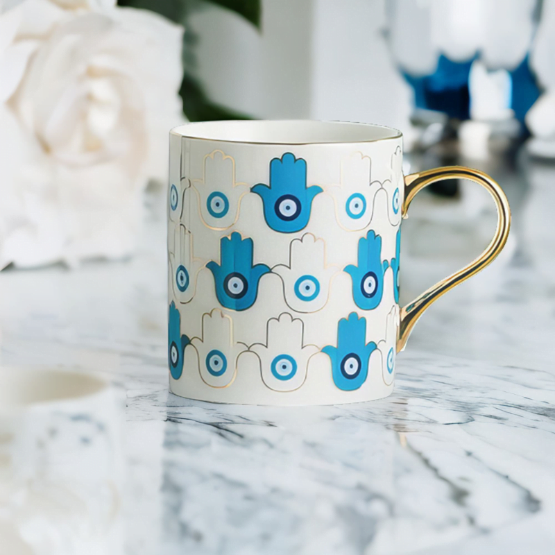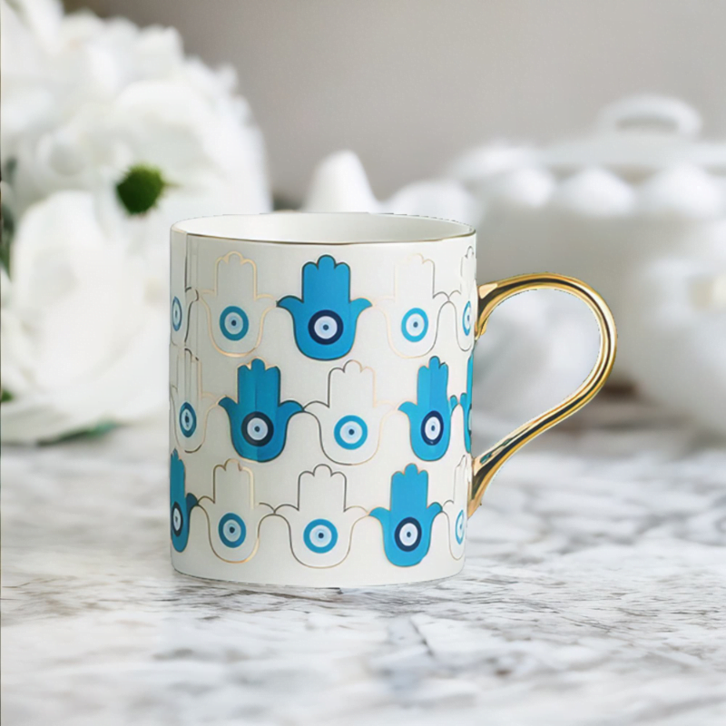 – Elegant Design – Painted in a traditional style, this mug is a stunning blend of elegance and symbolism. Featuring a beautiful hamsa hand design with gold handle and accents.