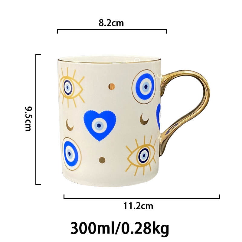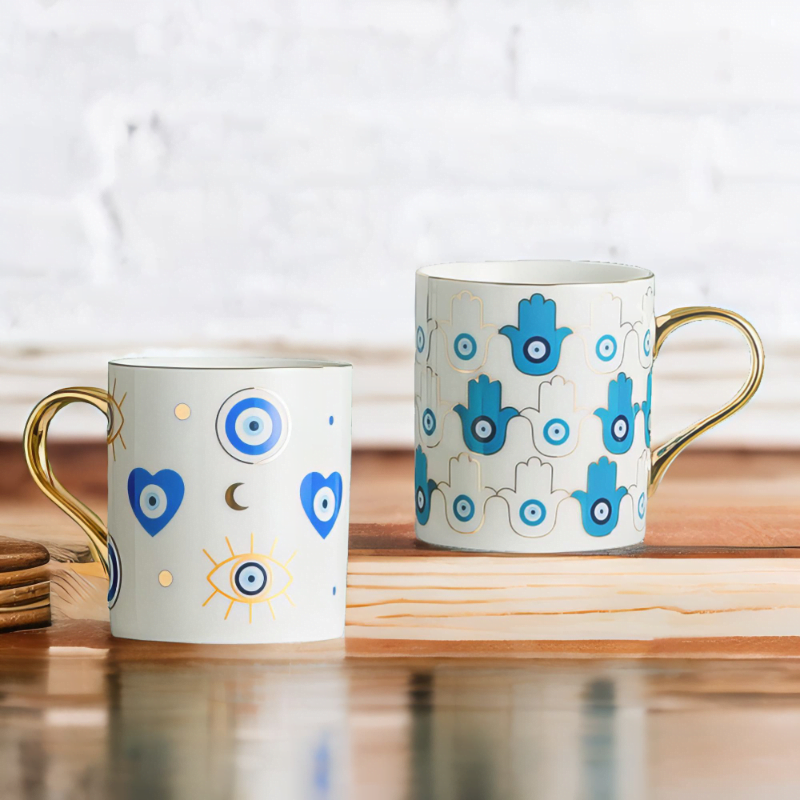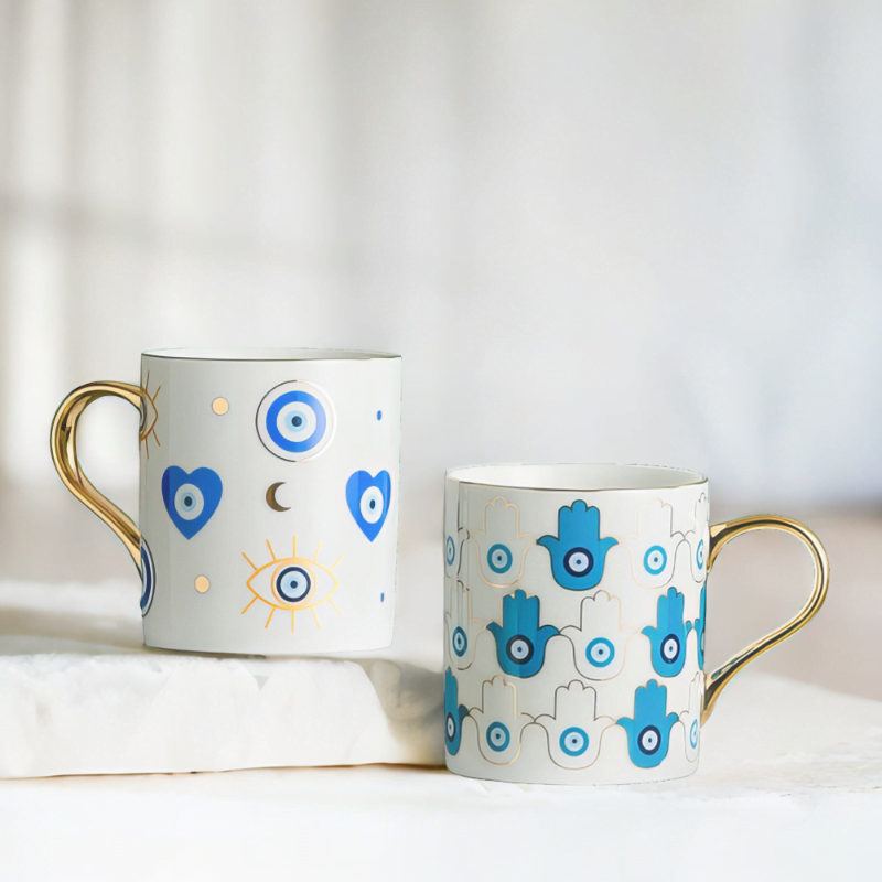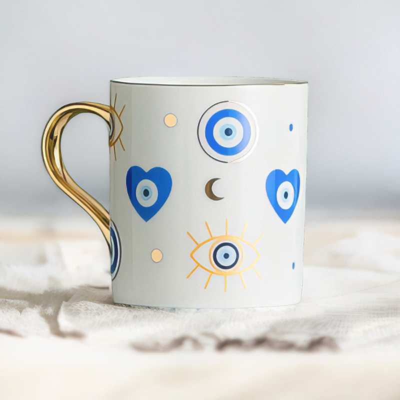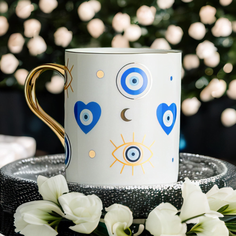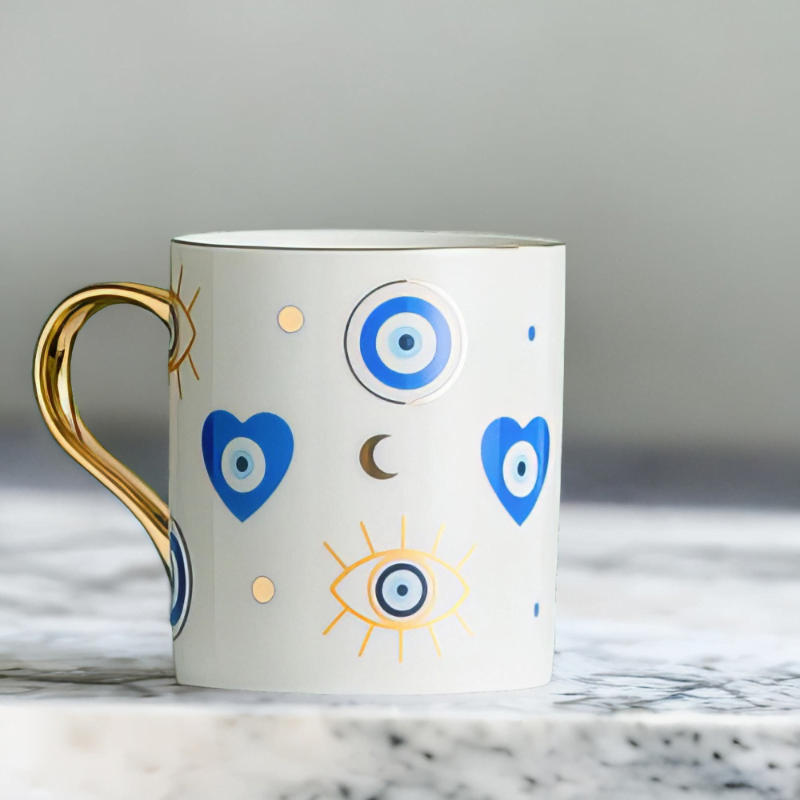 Explore the depths of cultural artistry with the distinctive Yasmeen Artisan Azure Evil Eye Heart Mug. Adorned with a traditional azure blue evil eye motif, this mug is an embodiment of style and meaningful symbols. Its elegant design and deep cultural roots offer a unique charm that captures the Mediterranean spirit.