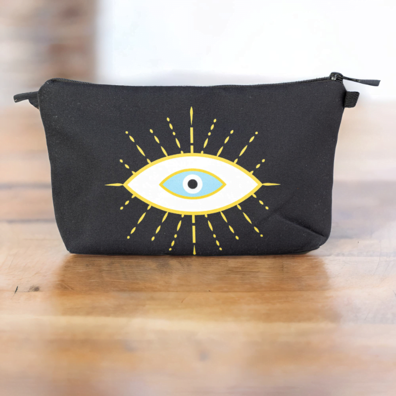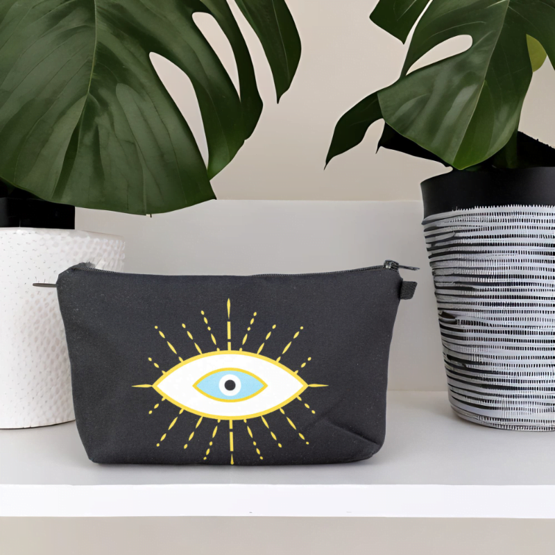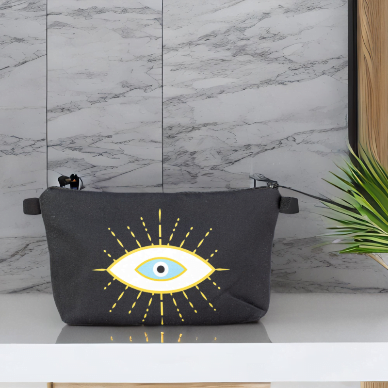 Presenting the Alma Bag: a sophisticated black cosmetic bag enhanced with a striking white and gold evil eye pattern.