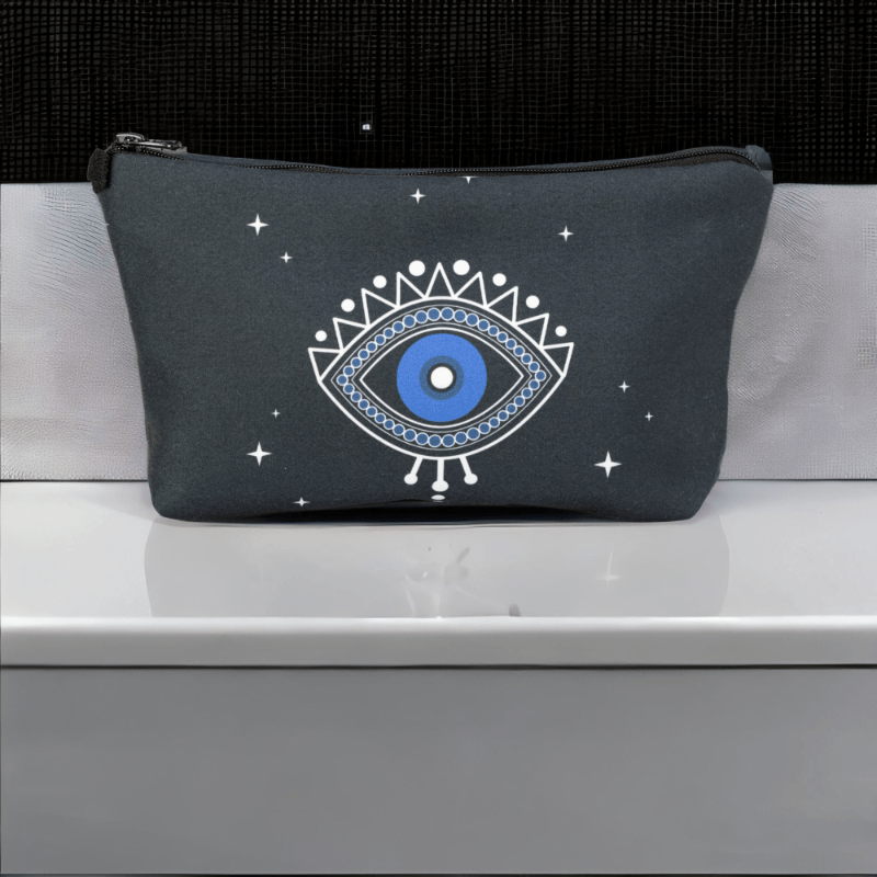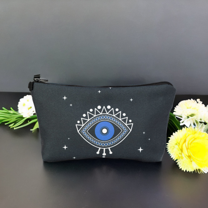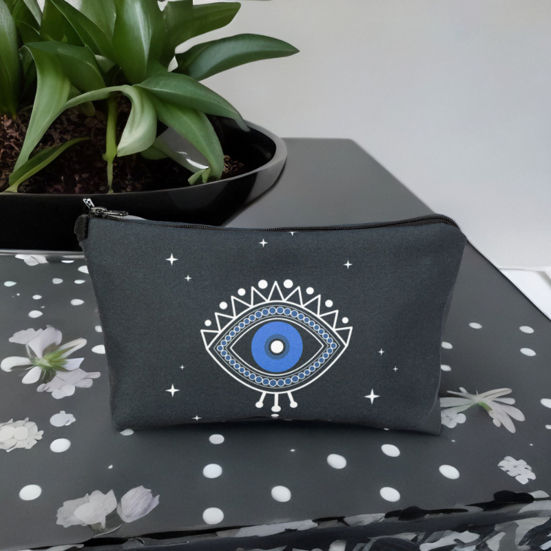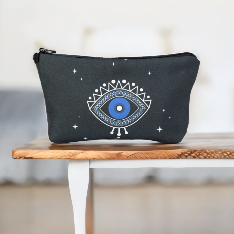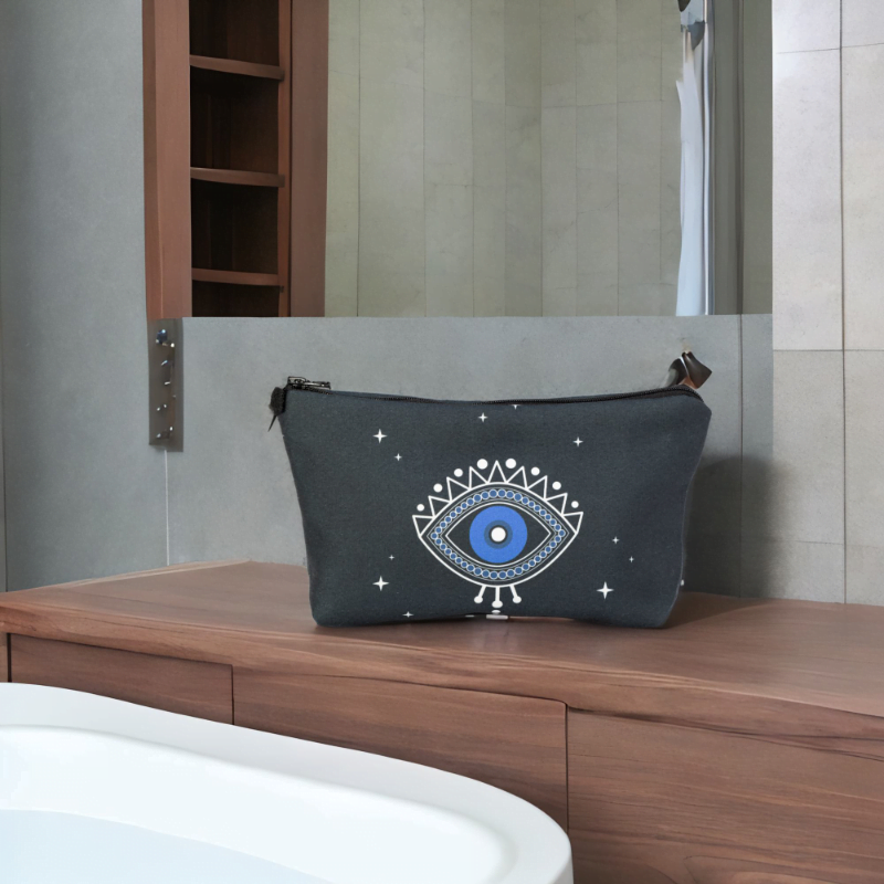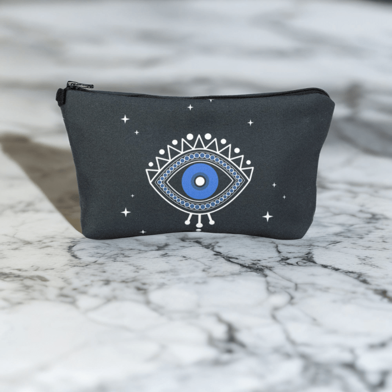 Discover the chic allure of the Black Star Cosmetic Bag, enhanced with vibrant Blue Evil Eye detailing for a touch of intrigue.