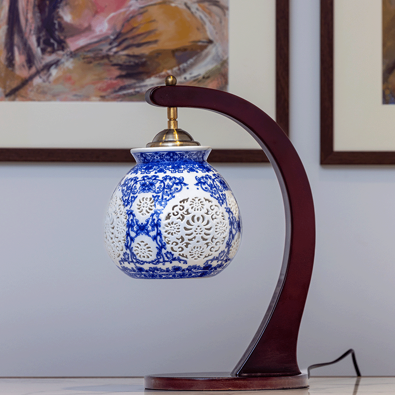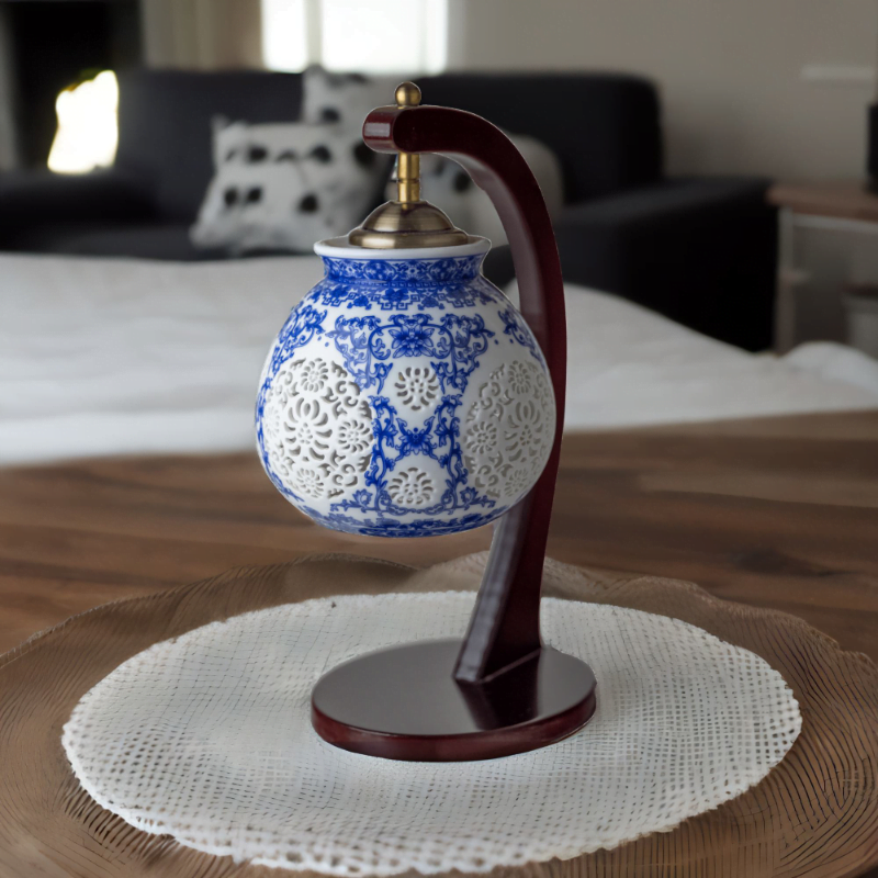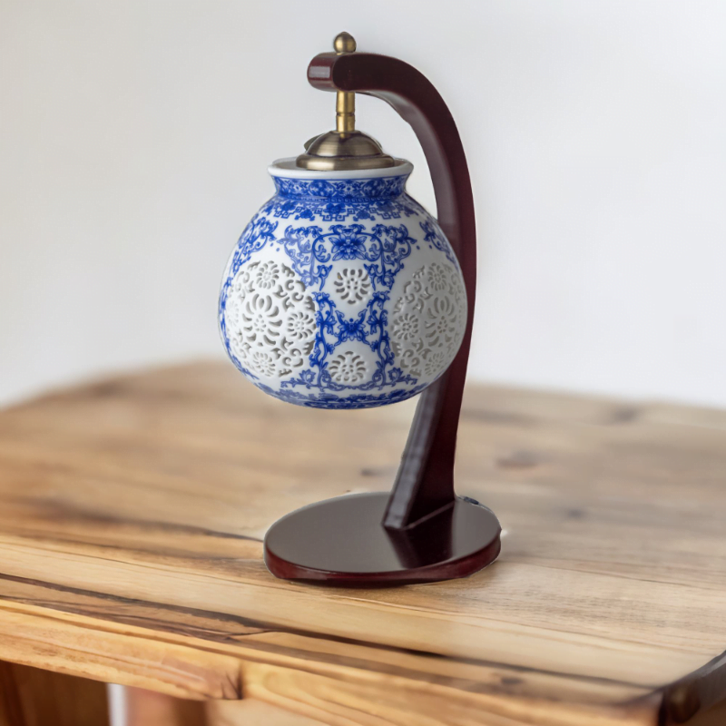 Introducing the Yasmeen Artisan Blue Wood Lamp, a captivating blend of traditional craftsmanship and contemporary design.
