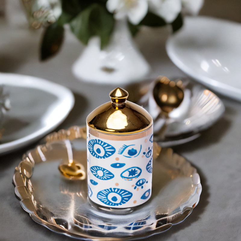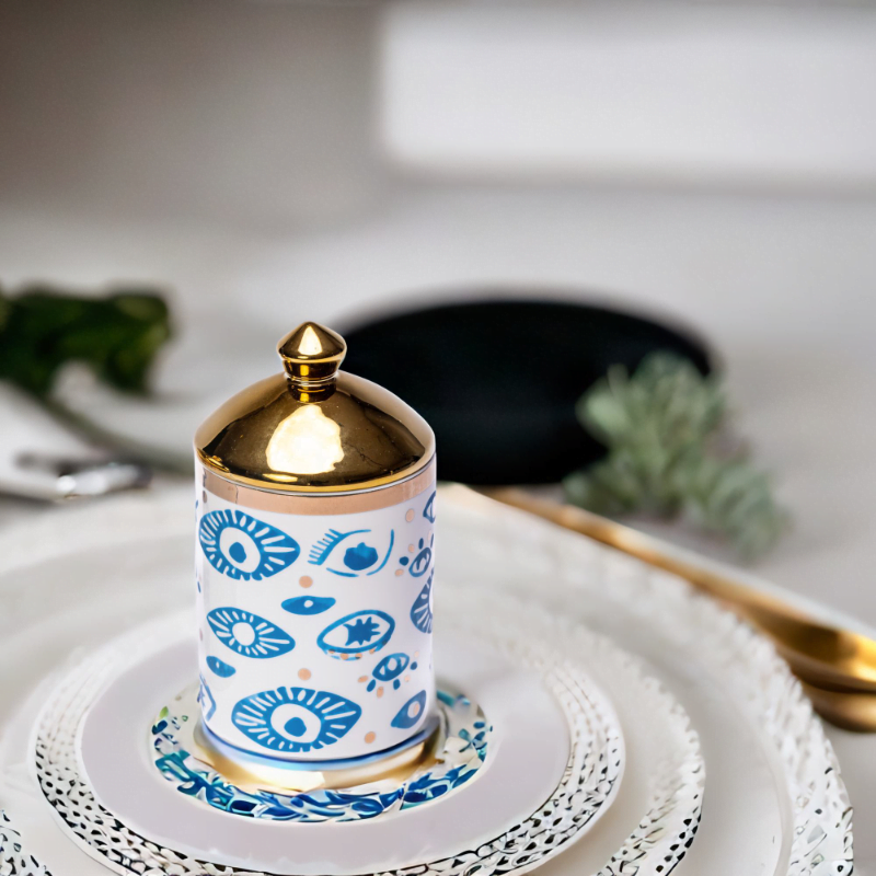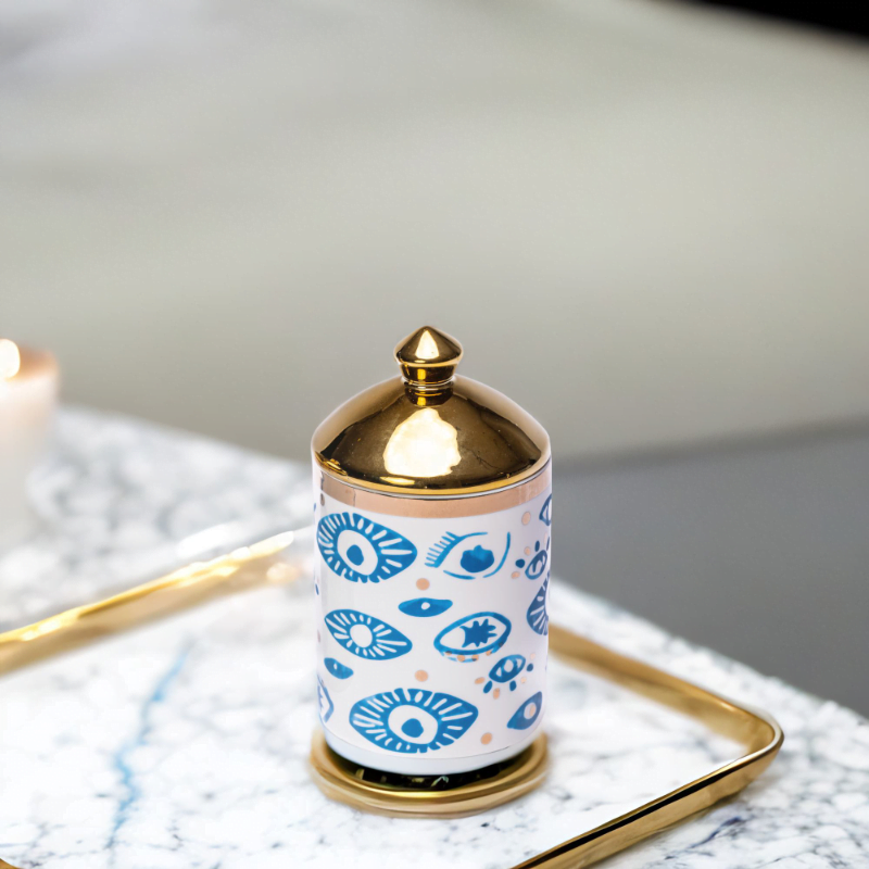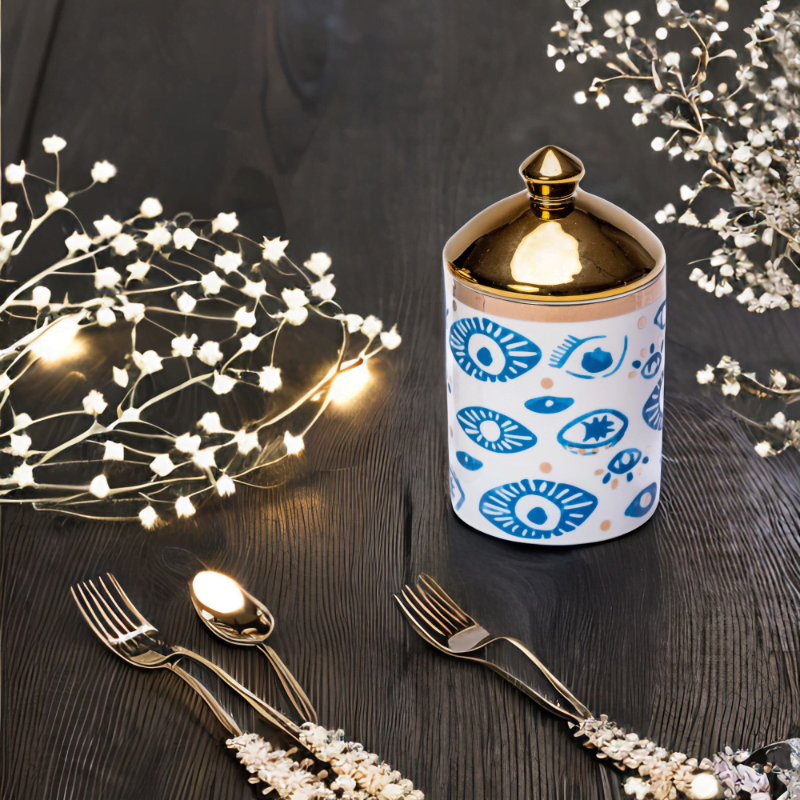 – Elegant Design – Handmade and painted in a traditional style, this canister is a stunning blend of elegance and symbolism. Featuring a beautiful blue evil eye design with gold cover.