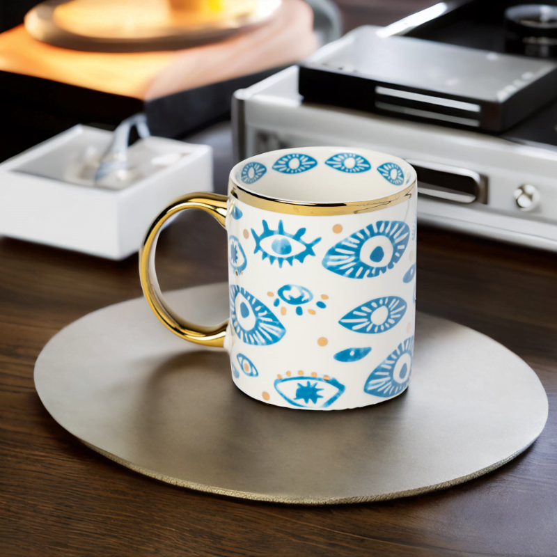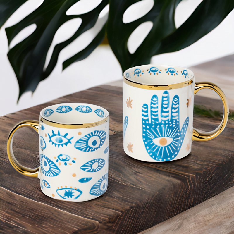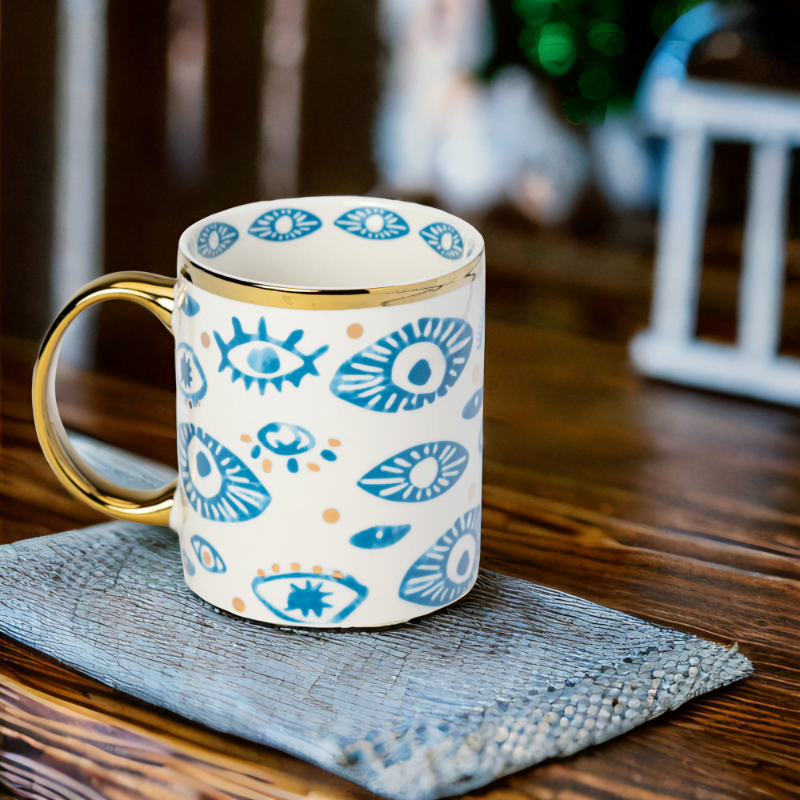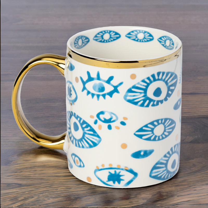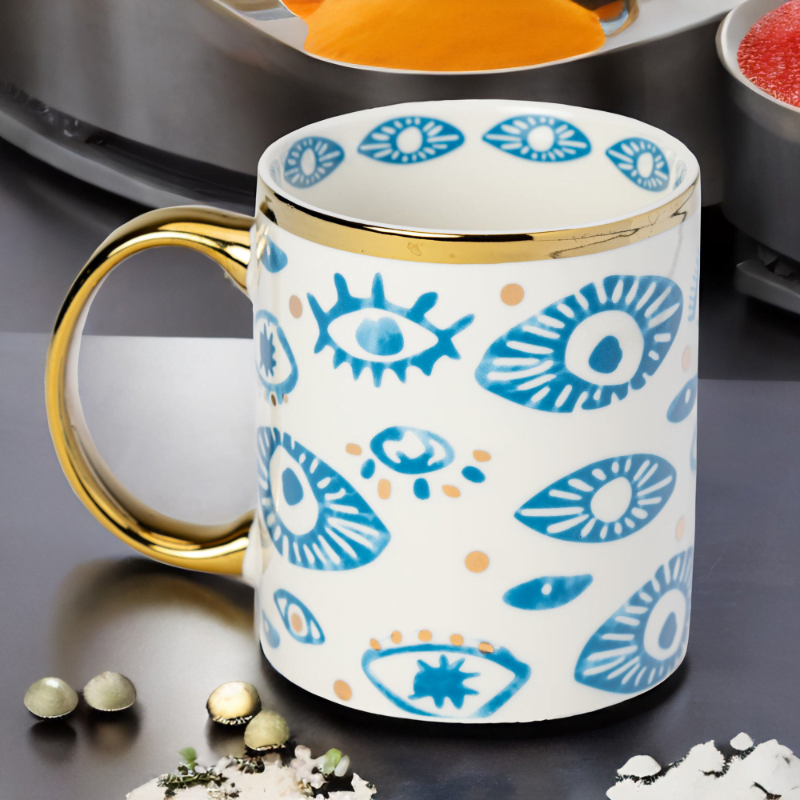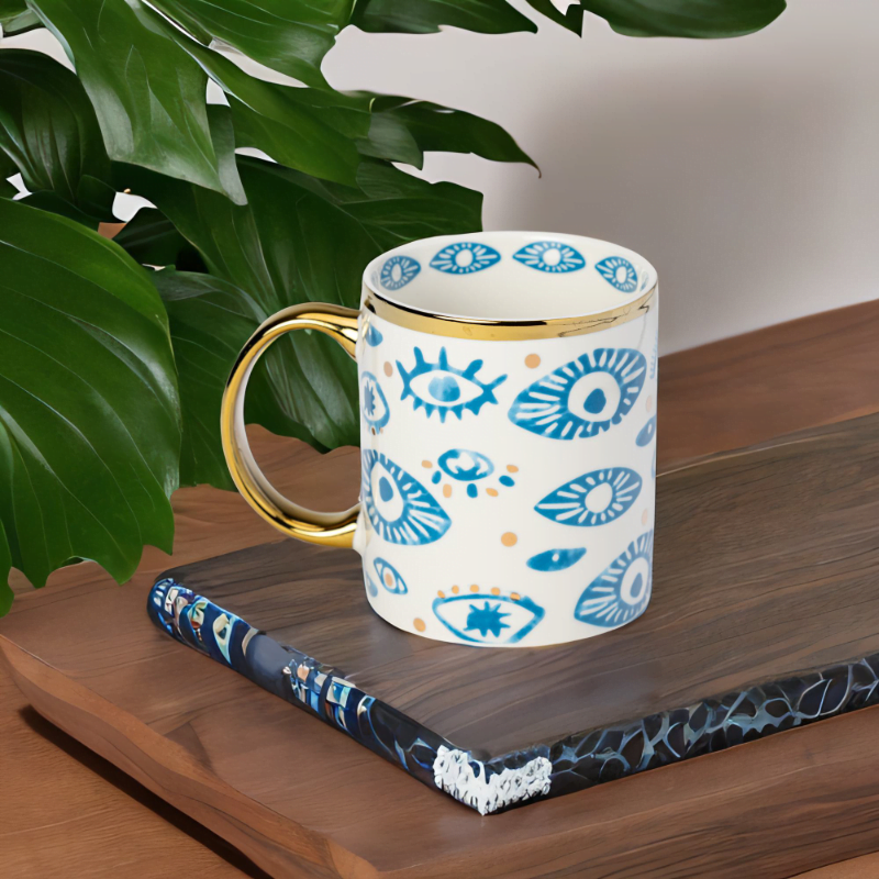 Discover the captivating appeal of Mediterranean elegance with the Yasmeen Artisan Evil Eye Mug – a testament to cultural beauty and design!