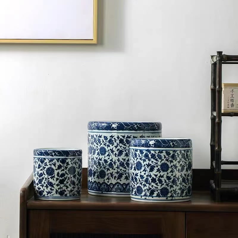 Introducing the Floral Open Jar Set – a trio of different-sized porcelain jars, featuring elegant white and blue floral patterns (No Lids)