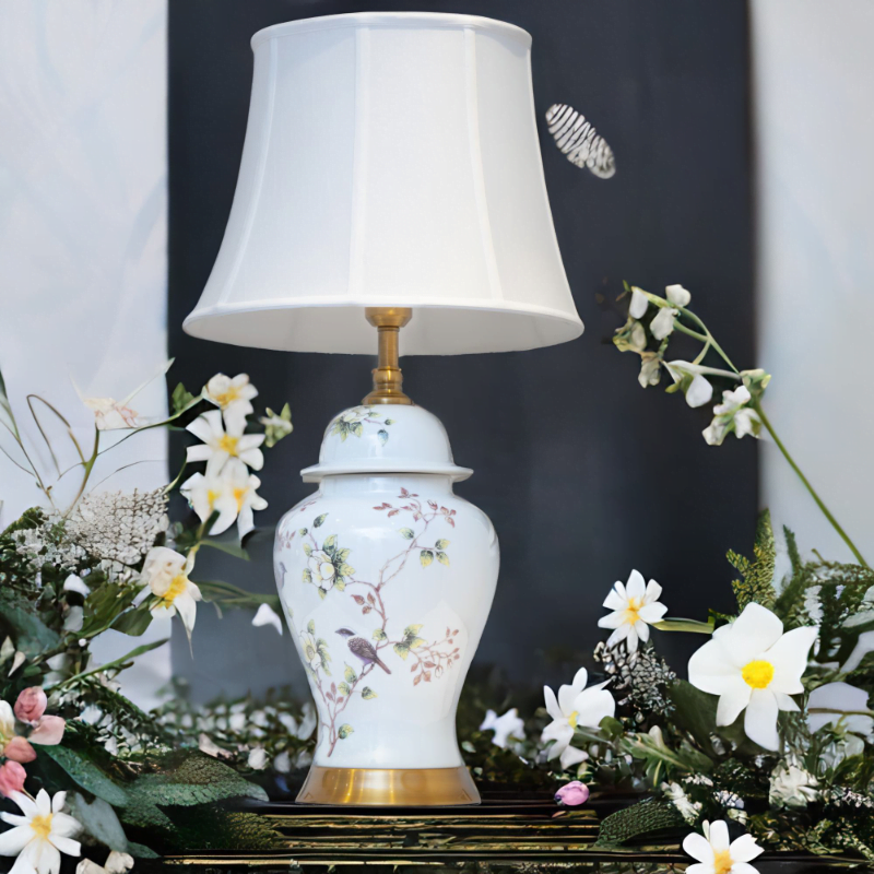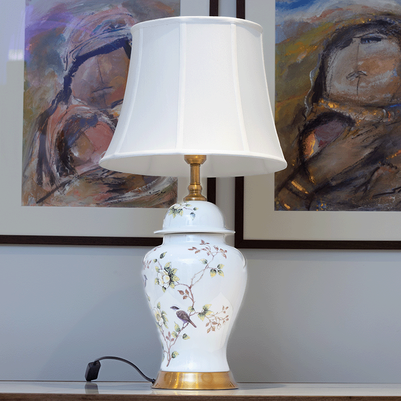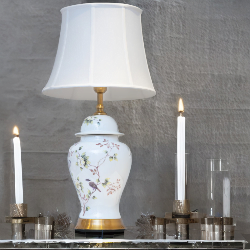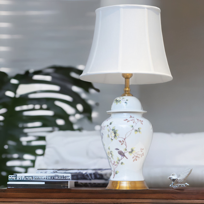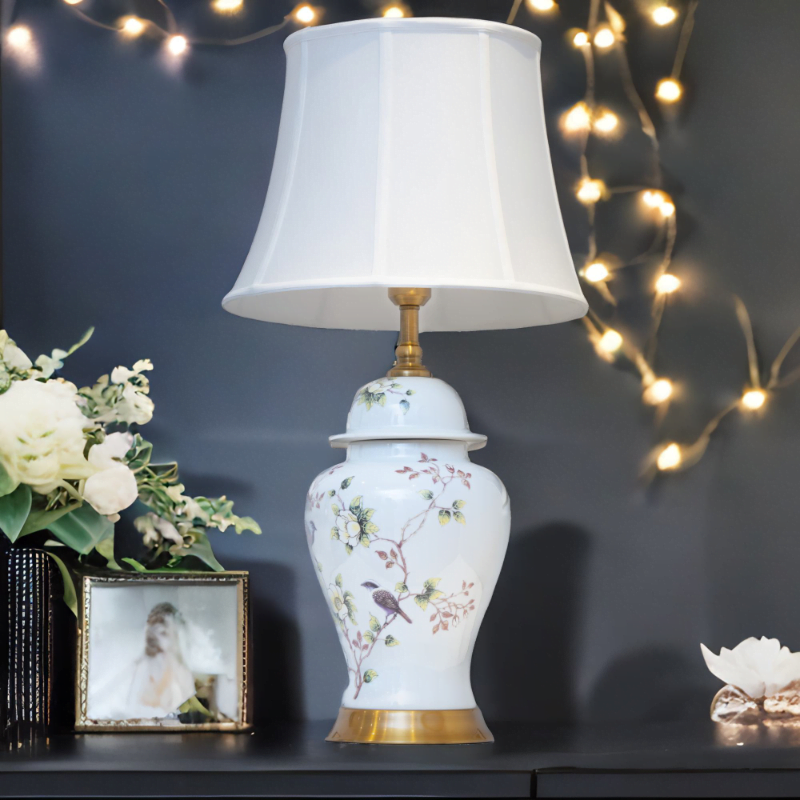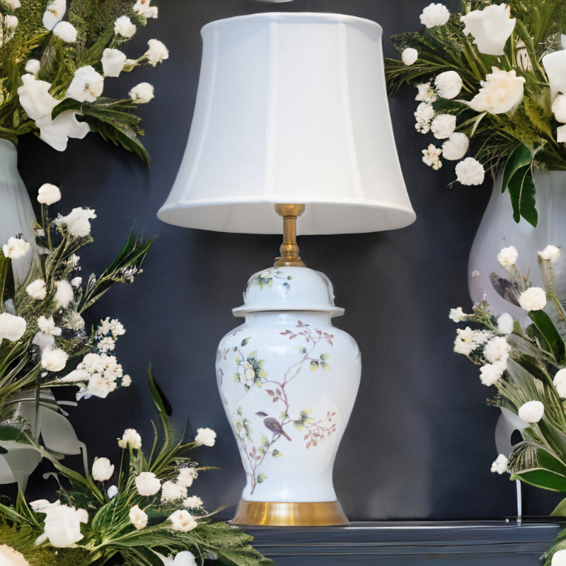 This exquisite ceramic table lamp showcases hand-painted flowers and birds in a modern artistic style. The Yasmeen Artisan Lamp is conveniently divided into two pieces and is accompanied by an elegant white shade.