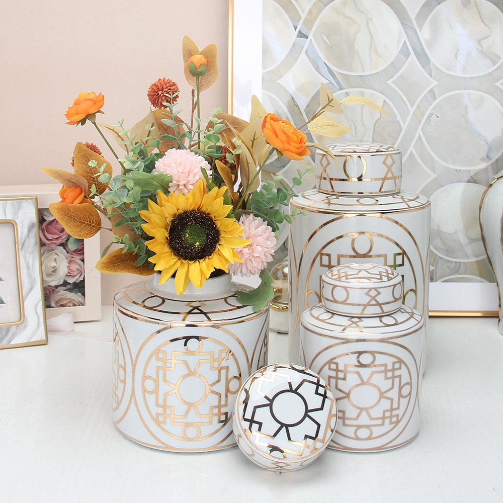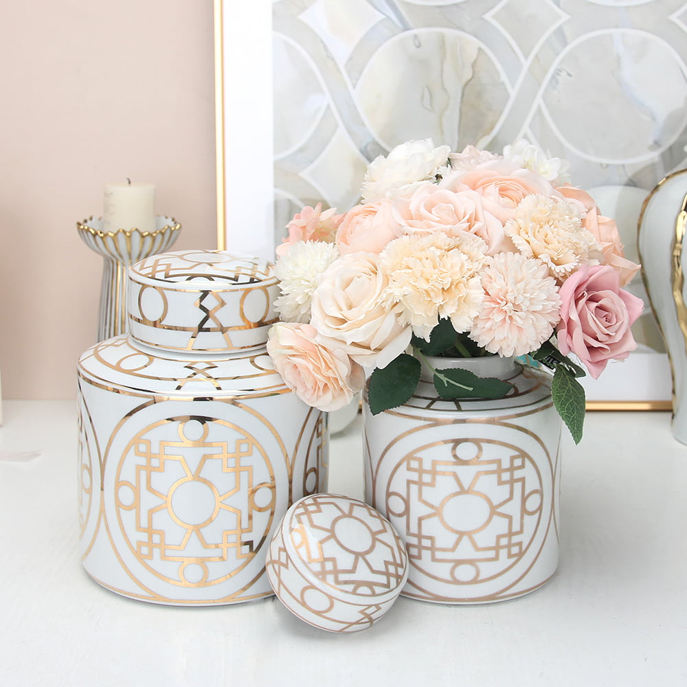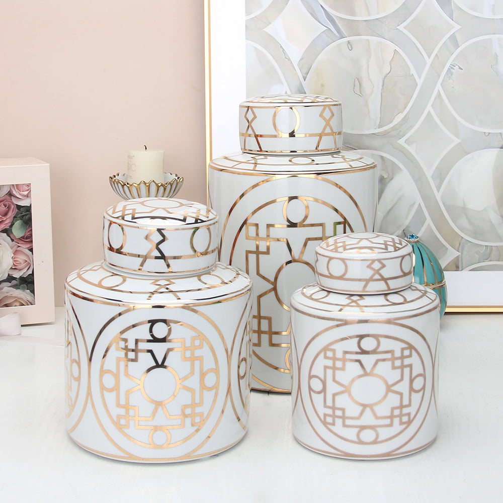 This set includes three ceramic white jars with elegant gold accents and matching lids.