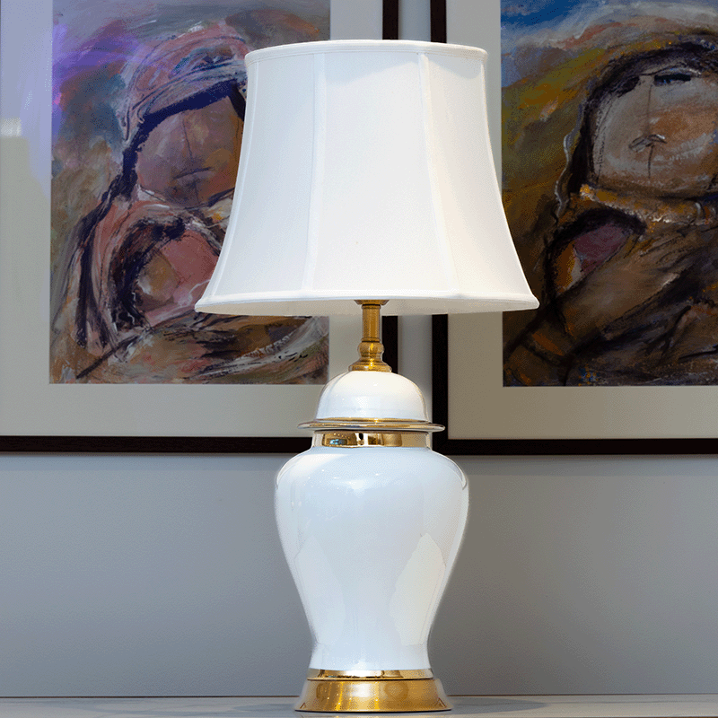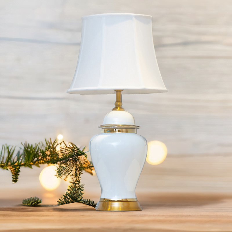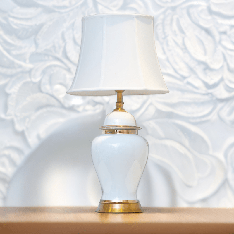 This elegant, minimalist white and gold lamp features a modern aesthetic and is paired with a matching white shade.