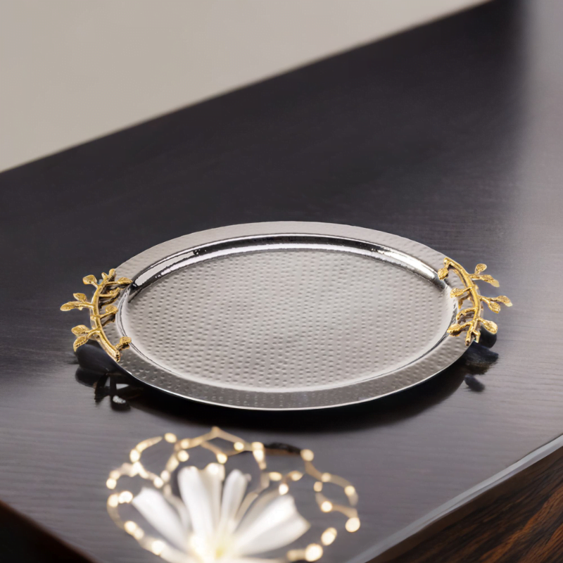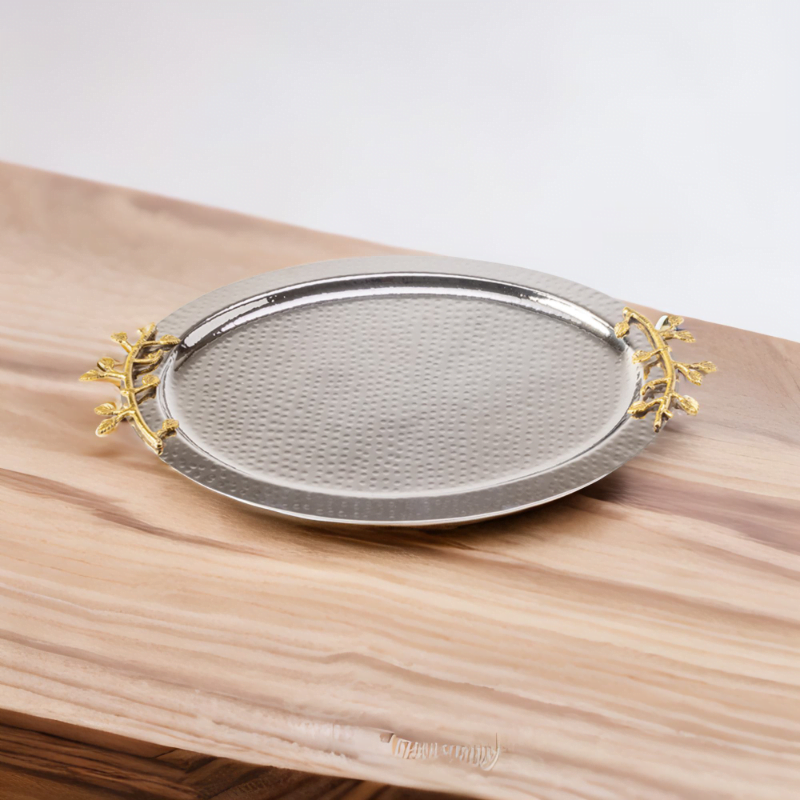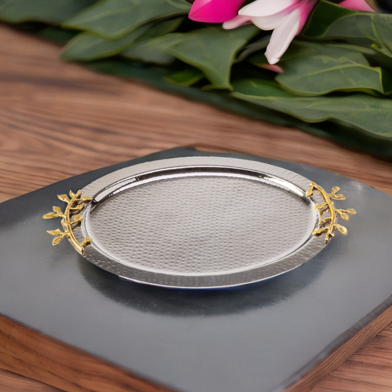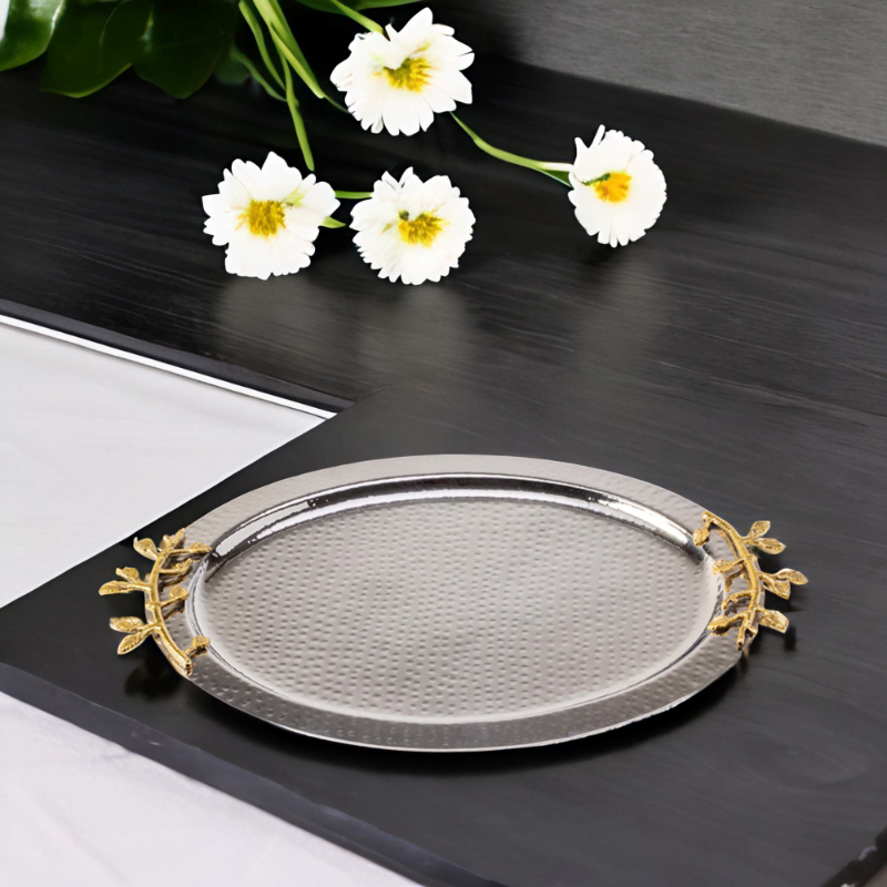 Enhance your table setting with this Hammered stainless steel oval silver tray with gold leaf handles- a Seamless Fusion of Style and Functionality!