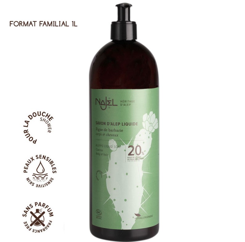 Discover the genuine Aleppo Soap in liquid form. It is made from olive oil and bay laurel oil, ingredients of the genuine hard Aleppo Soap, so you will find all the same virtues as true Aleppo Soap. A liquid soap to use in the shower! The use of precious oils, with nourishing and soothing properties, makes this Aleppo Liquid Soap a care treatment for the hygiene of all skin types, especially dry and sensitive skins. This Aleppo Soap is enriched with 20% Cactus seed oil and cleanses the skin while moisturizing. Extremely rich in both vitamin E and essential fatty acids, Cactus seed oil has a regenerating effect, protecting skin and restoring suppleness and elasticity. Thanks to the soothing properties of bay laurel oil, it leaves skin soft and protected from irritation.