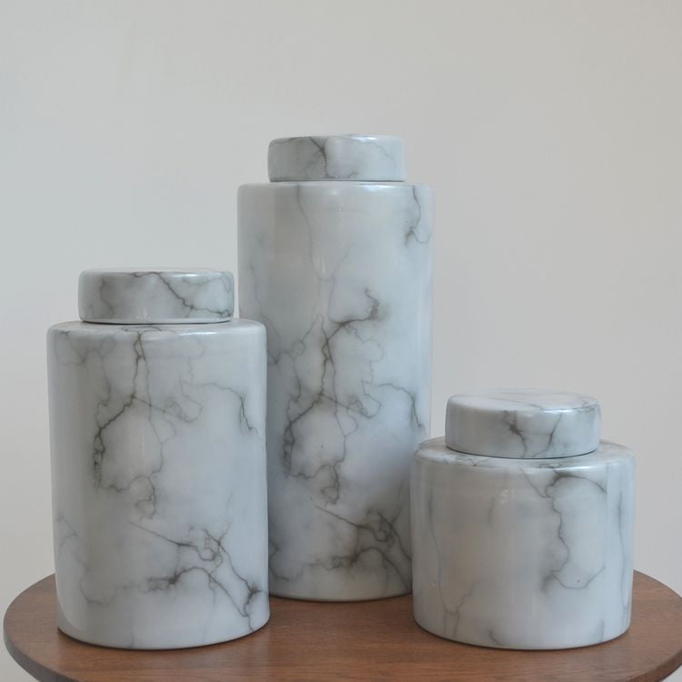 This set includes three stunning marble jars with matching lids, each in a different size to suit your storage needs: