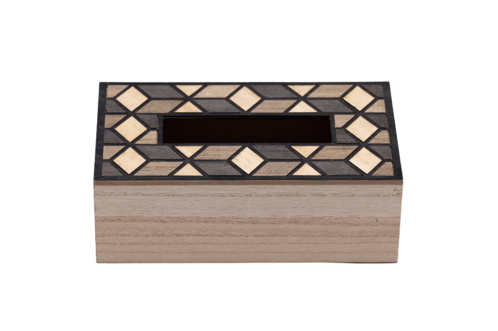 Handcrafted from wood, it features a stunning mosaic-like design. Practical and artistic, it conceals standard tissue boxes while adding elegance to any room.