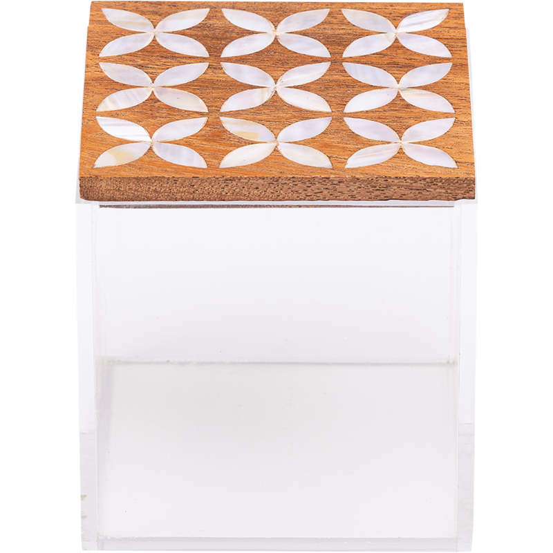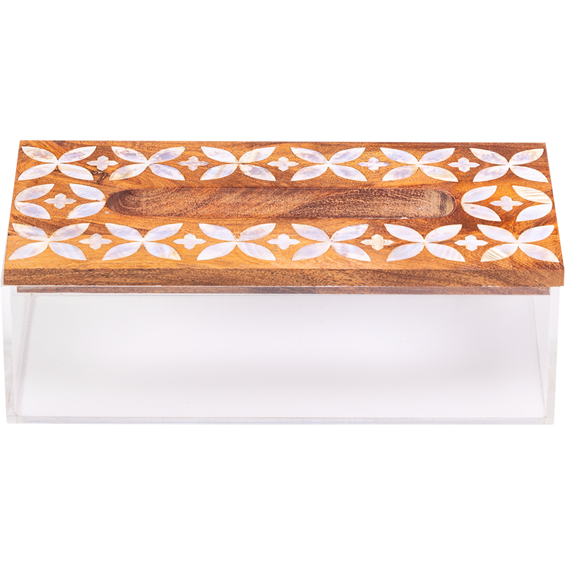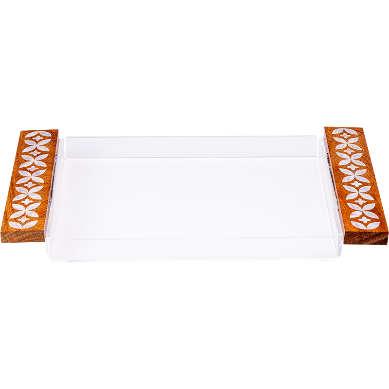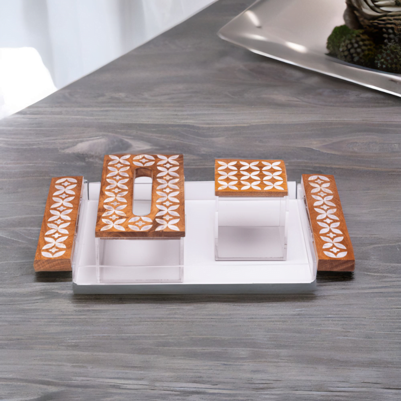 – Quality Craftsmanship – With attention to detail, the modern mother of pearl design is shown in the tray handles, tissue box and tea box cover. The bases for the tray, tissue and tea box are made from acrylic.