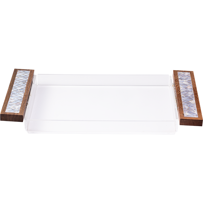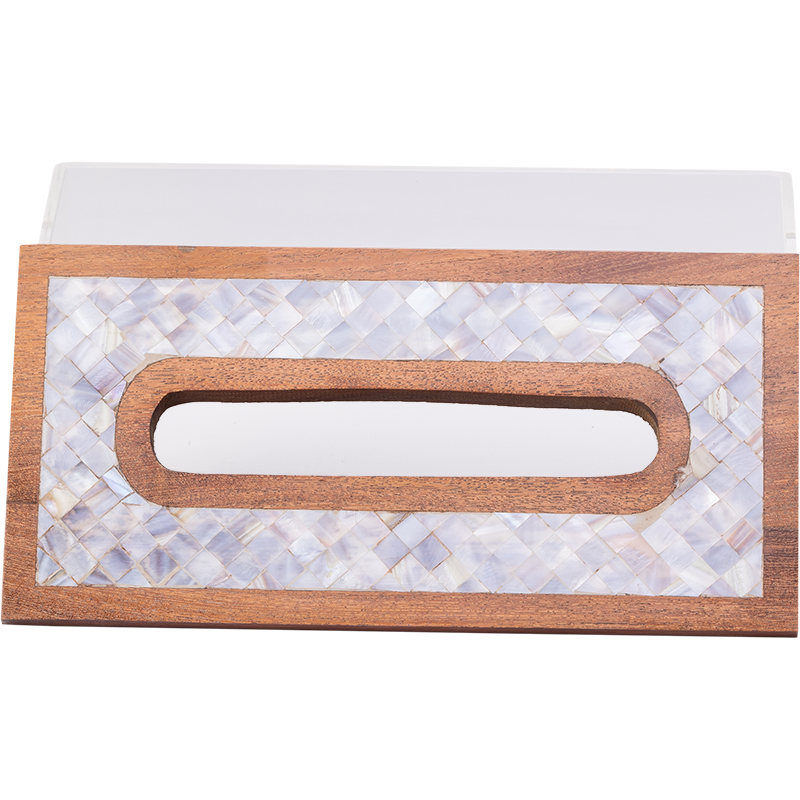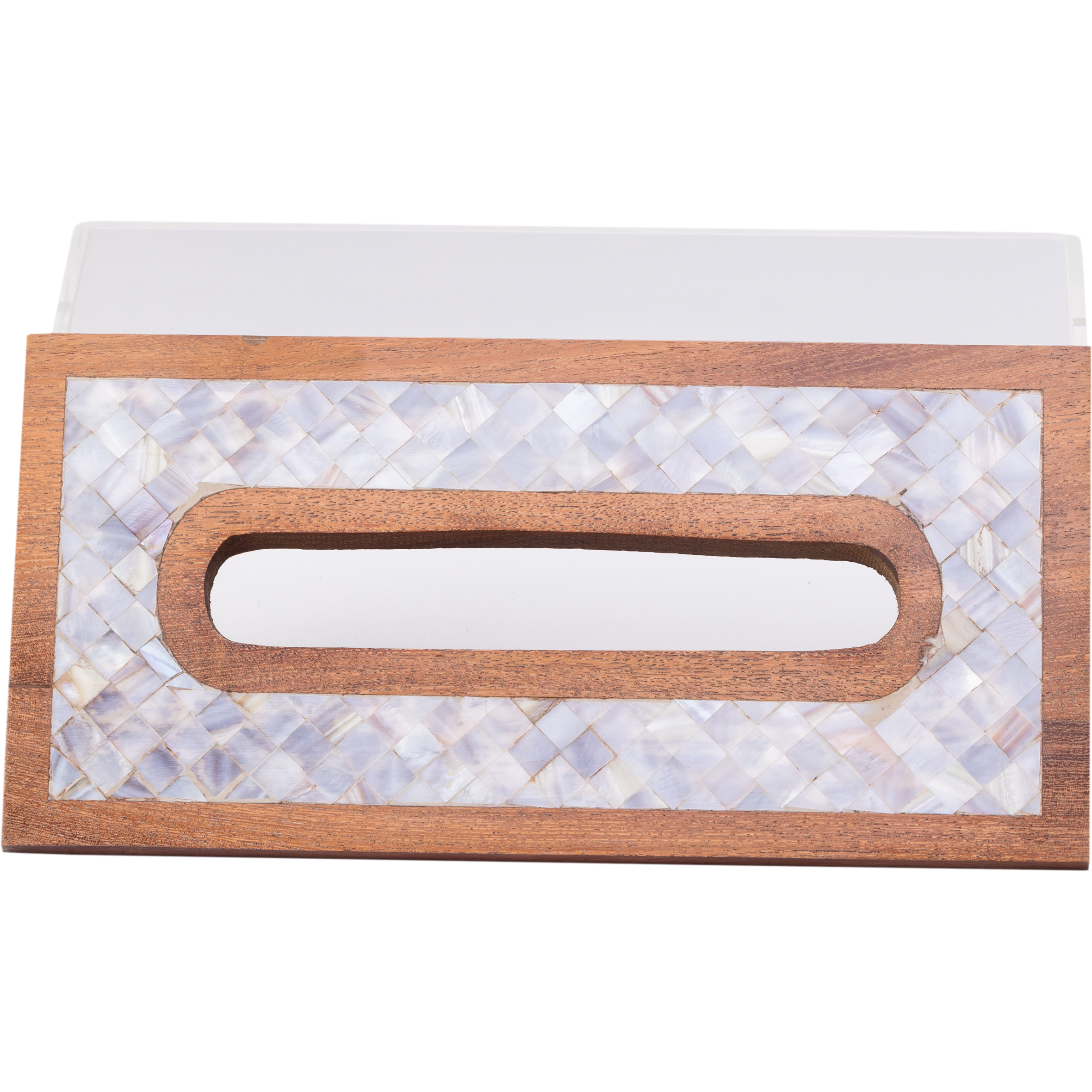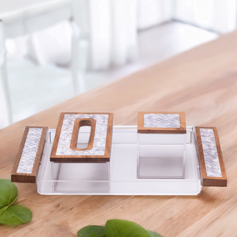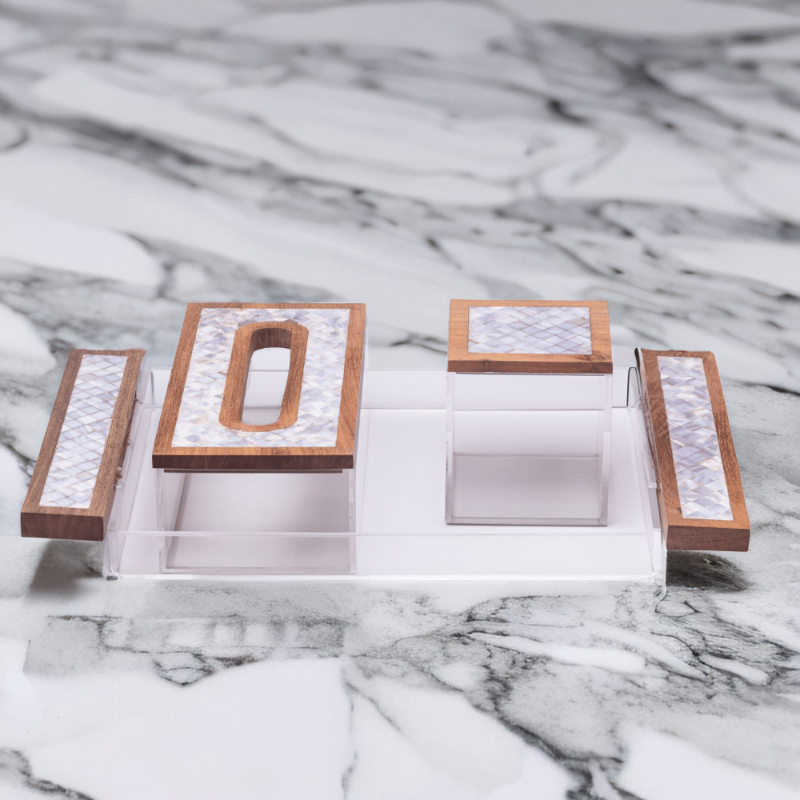 – Quality Craftsmanship – With attention to detail, the modern mother of pearl design is shown in the tray handles, tissue box and tea box cover. The bases for the tray, tissue and tea box are made from acrylic.