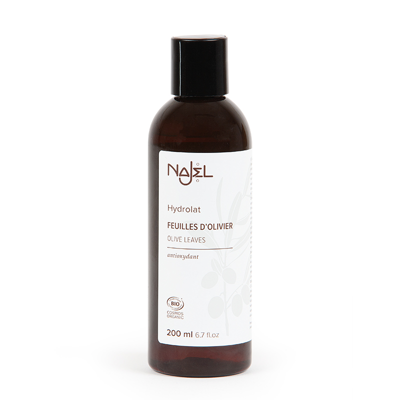 The olive tree leaf, with its characteristic greengrey color, has many virtues for skin care. In fact, olive tree leaves contain more oleuropein – a strong antioxidant – than the olive itself. Najel Hydrolate, obtained by steam distillation of organic olive leaves, reduces signs of aging and neutralizes free radicals. It is made up of active antioxidants, terpenes, that detoxify cells and protect skin from free radicals. Olive leaf hydrolate, known for its antiseptic properties, thoroughly purifies skin and scalp. Known for its soothing and calming effects, it gently cleanses even the most fragile of skins. This hydrolate leaves your skin feeling pleasantly soft and refreshed, with a light herbaceous note. It helps to detoxify and soothe skin and scalp. Obtained by steam distillation 1:20 from organic dry leaves