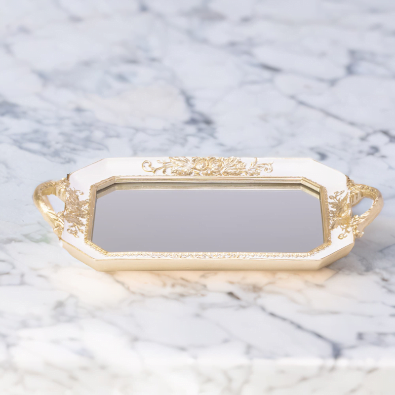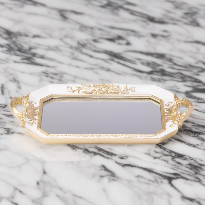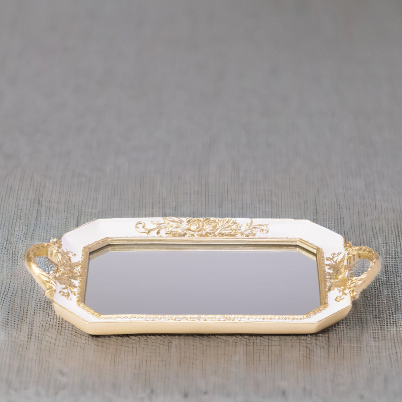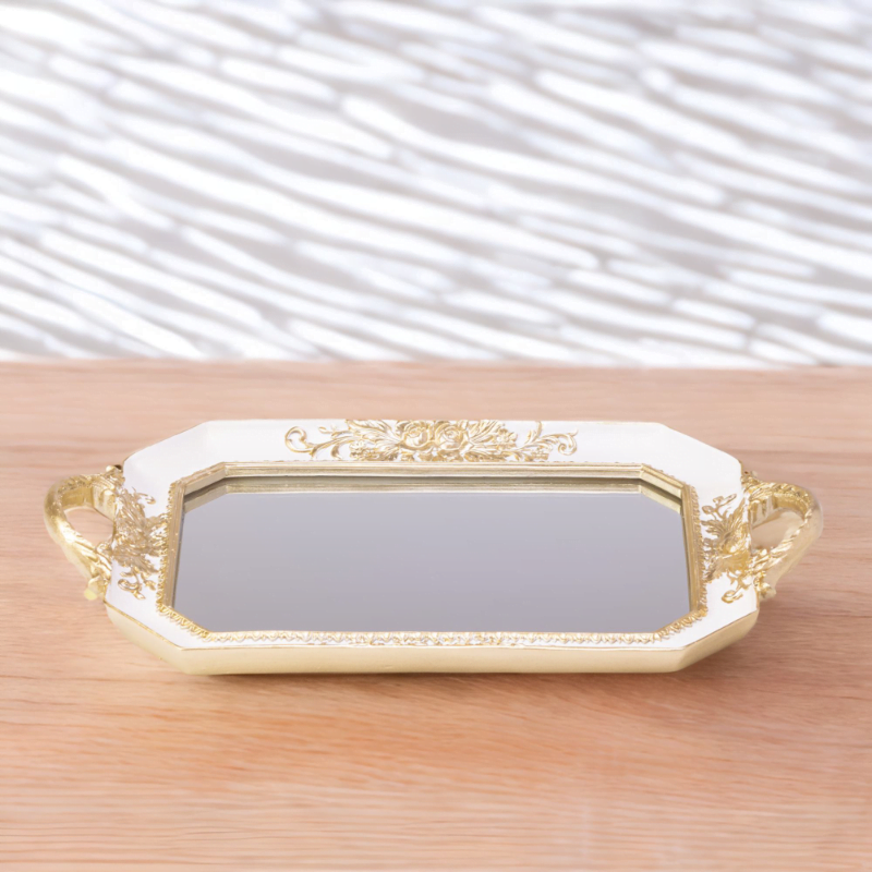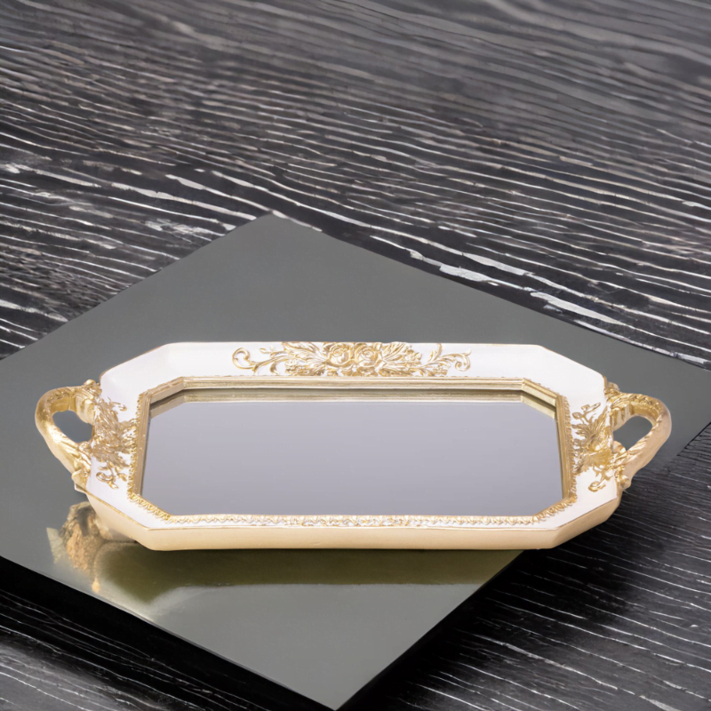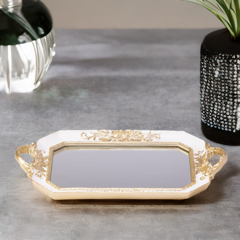 Improve your home decor by incorporating Yasmeen Artisan’s Octagon Mirror Tray adorned with elegant white and gold accents.