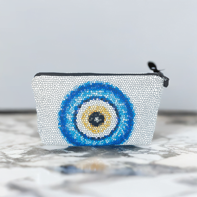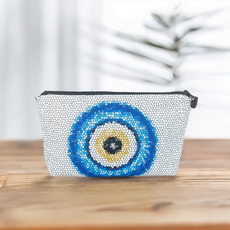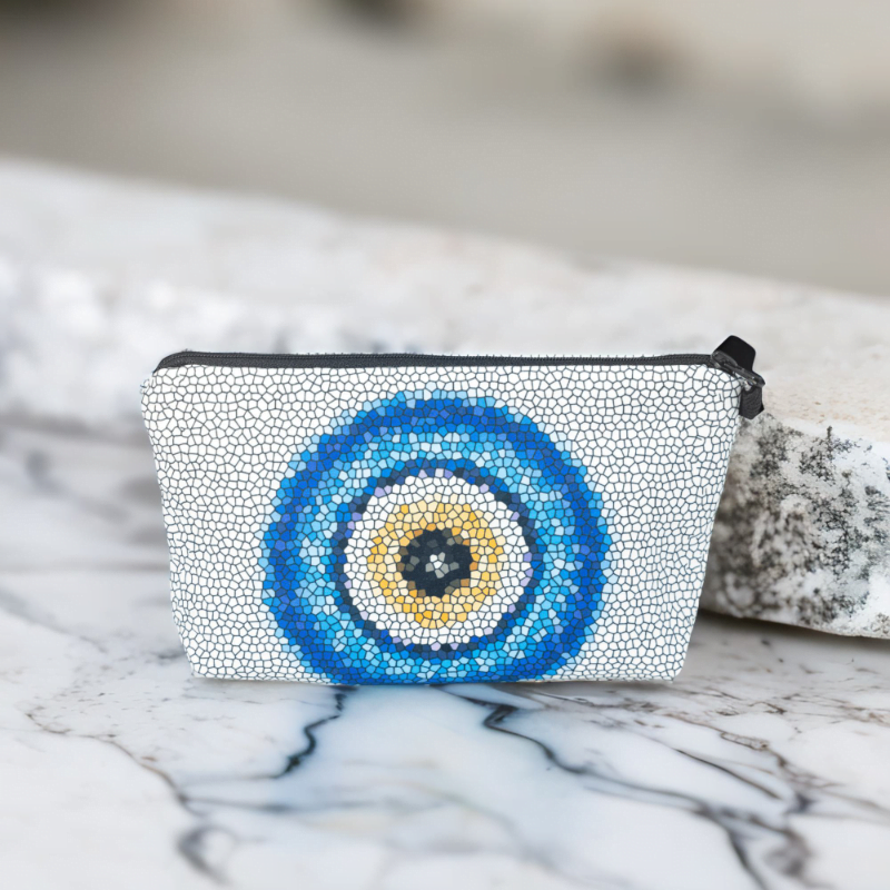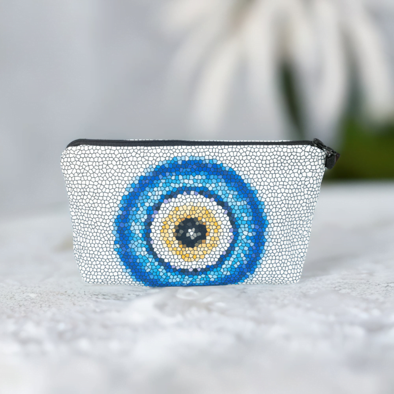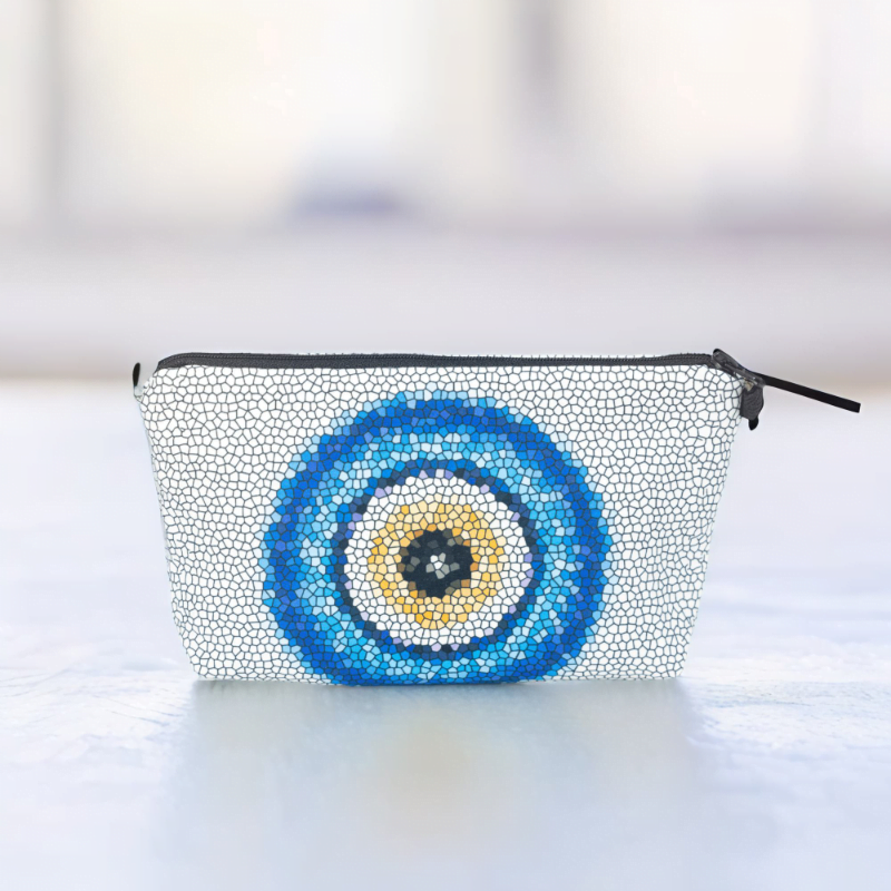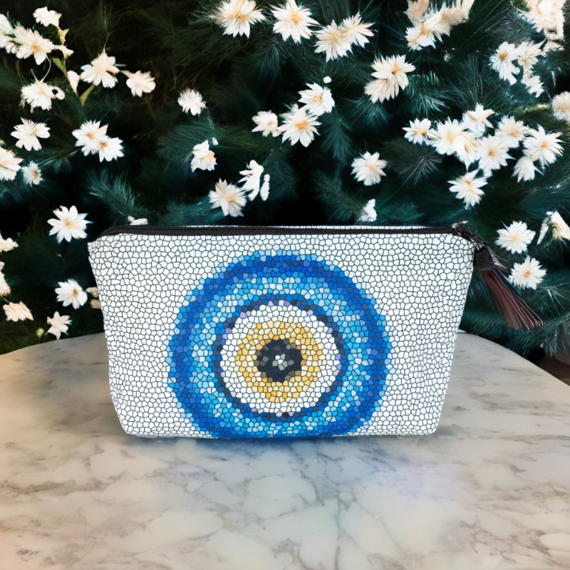 Elevate your style with the Nadine Bag, a white cosmetic accessory adorned with an intricate mosaic pattern and a prominent blue and yellow evil eye motif at its centre.