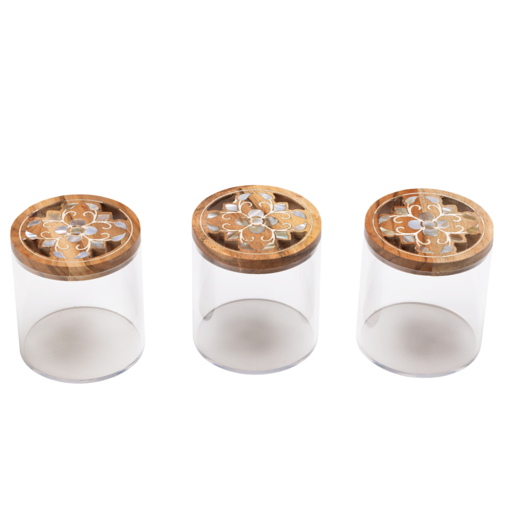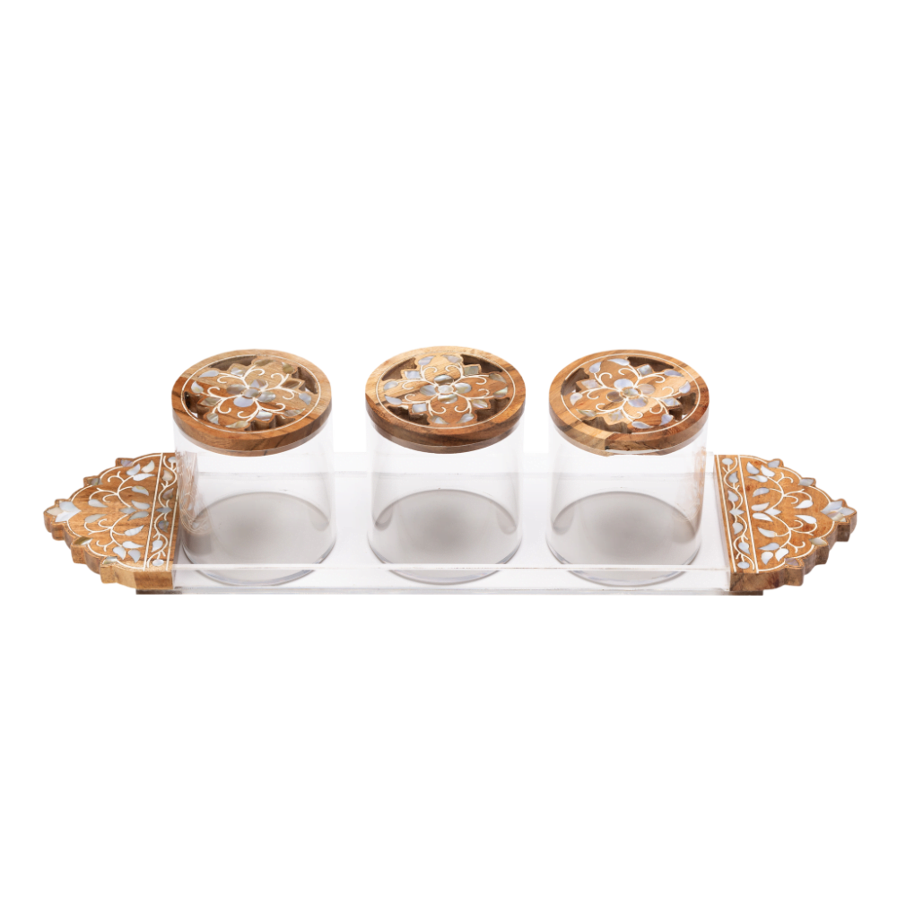 This set includes a stunning long acrylic and wood tray adorned with a beautiful mother of pearl floral pattern, accompanied by three matching acrylic and wood canisters.